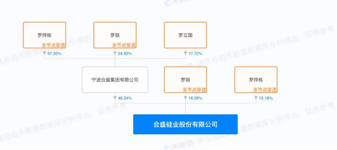 近年来,罗立国有意退居幕后,女儿罗燚、儿子罗烨栋于2021年进入实际控制人团队。通过股权穿透,罗烨栋、罗燚、罗立国三者直接或间接手握合盛硅业股权分别为41.7%、27.8%、8.2%,合计高达近80%。