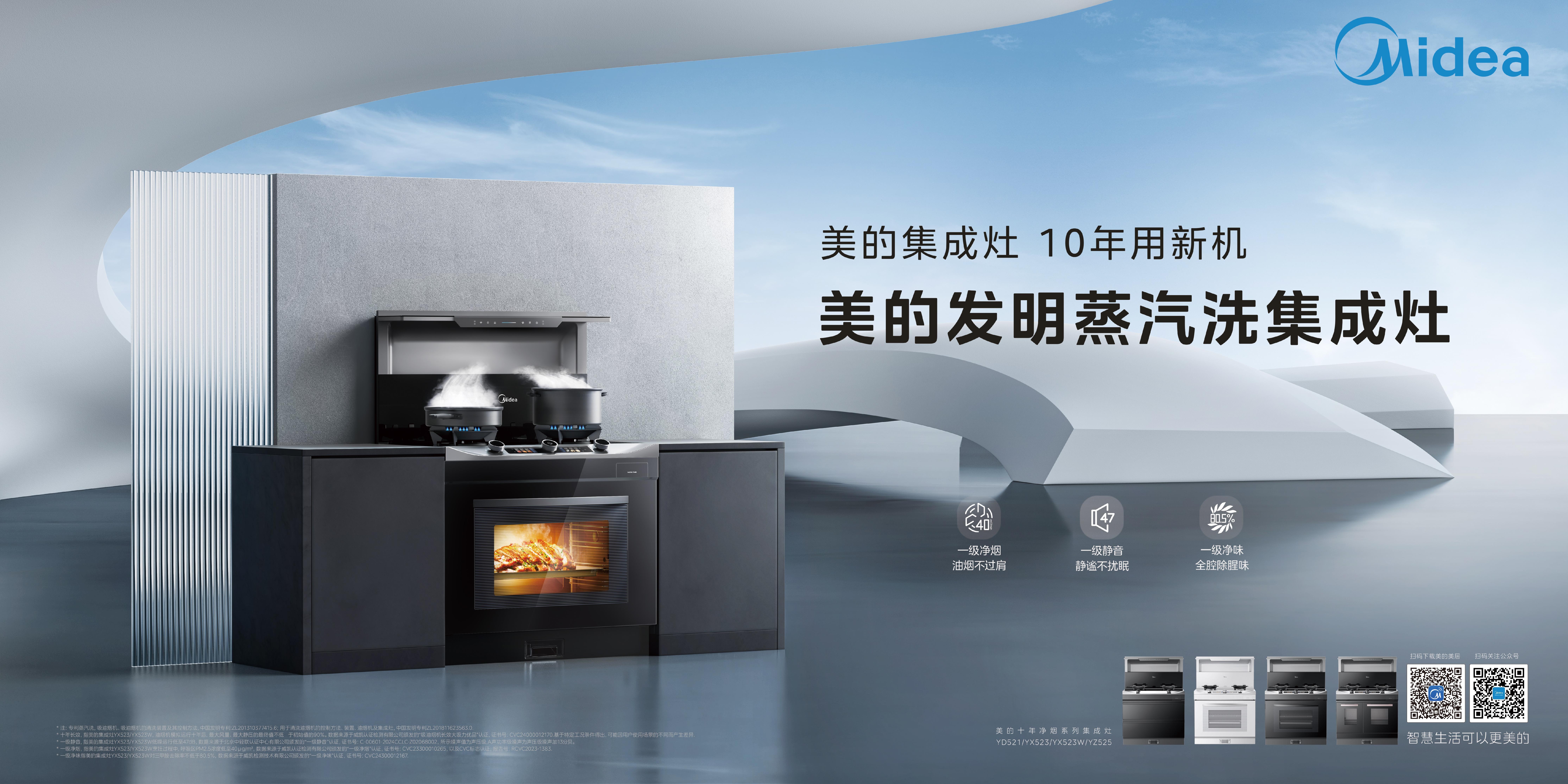 在集成灶方面,美的今年年初推出了首台10年净烟集成灶,采用独家专利的蒸汽洗2.0系统,拥有43项发明专利。该产品在各项性能领域均刷新了行业记录,具备十年长效净烟、顶级吸力和超强静音,以核心技术提升家庭生活,全面升级用户体验。