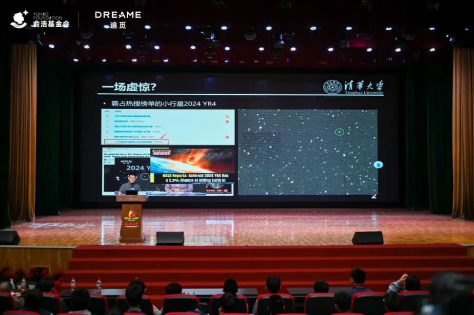 在课堂分享中,清华大学航天航空学院助理教授程彬以《当小行星来袭,我们如何挺身而出》为主题,向学生们系统介绍了小行星撞击风险与行星防御前沿进展。