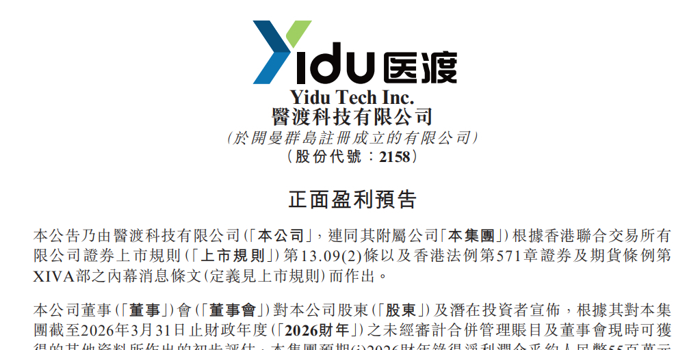 4月20日,国内AI医疗头部企业医渡科技(2158.HK)发布了一则令市场振奋的盈利预喜公告。公告显示,公司预计截至2026年3月31日止的2026财年将录得净利润约5500万元至7000万元人民币,实现公司自成立以来首个全年盈利。这一里程碑式的突破,标志着医渡科技正式跨过了从“烧钱布局”到“自我造血”的关键分水岭。