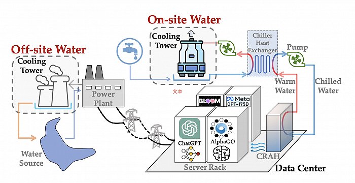 AI的发展都基于大规模的数据中心,而数据中心耗电量巨大,95%以上的电能会转化成热能。降热降温需要消耗大量的水。现在主要有两种方式降温:一种是利用水蒸发带走热量,也就是利用冷却塔,这个过程需要消耗大量的水;还有一种是直接用空气流动散热,通俗地说就是“用风吹”,但在天气热的时候需要用水预凉,天气干燥的时候需要用水加湿。