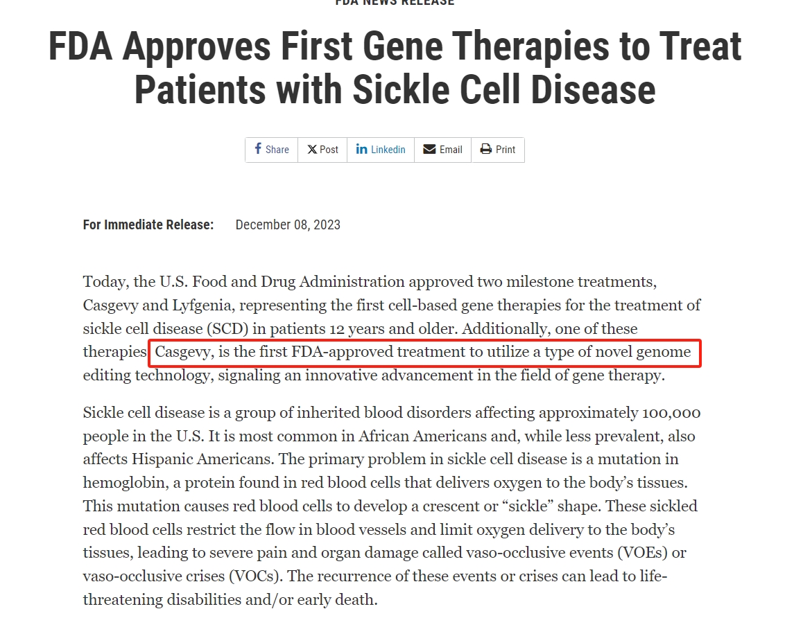 当地时间12月8日,美国食品药品监督管理局(FDA)官网发布消息表示,批准CRISPR Therapeutics/Vertex的基因疗法Casgevy和bluebird bio的基因疗法Lyfgenia上市,这是美国首次批准适用于12岁及以上镰状细胞病(SCD)患者、基于细胞的基因疗法。其中Casgevy是FDA批准的首款运用CRISPR/Cas9基因编辑技术的疗法,标志着基因治疗领域的创新进步。